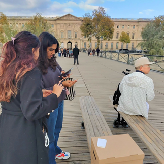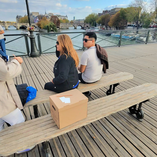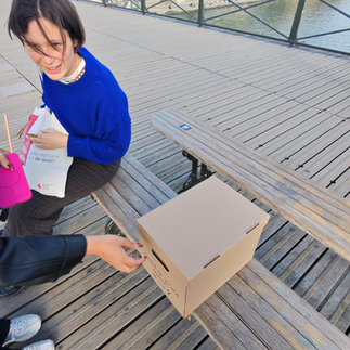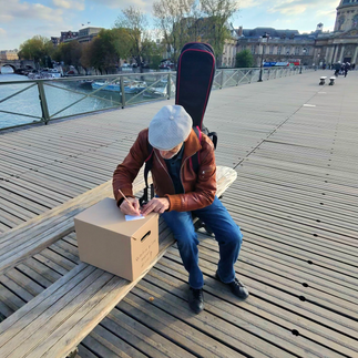 On October 14, 2025, on a bridge over the Seine in Paris, this question was placed into the flow of the city. The action deliberately resisted the conventions of performance. There was no theatrical gesture, no narrative guidance, no explicit invitation. Only a box, a few cards, and a single question. Precisely through this restraint, the work gained its strength. The artist did not occupy the center of the scene, but its threshold — present, attentive, observing.